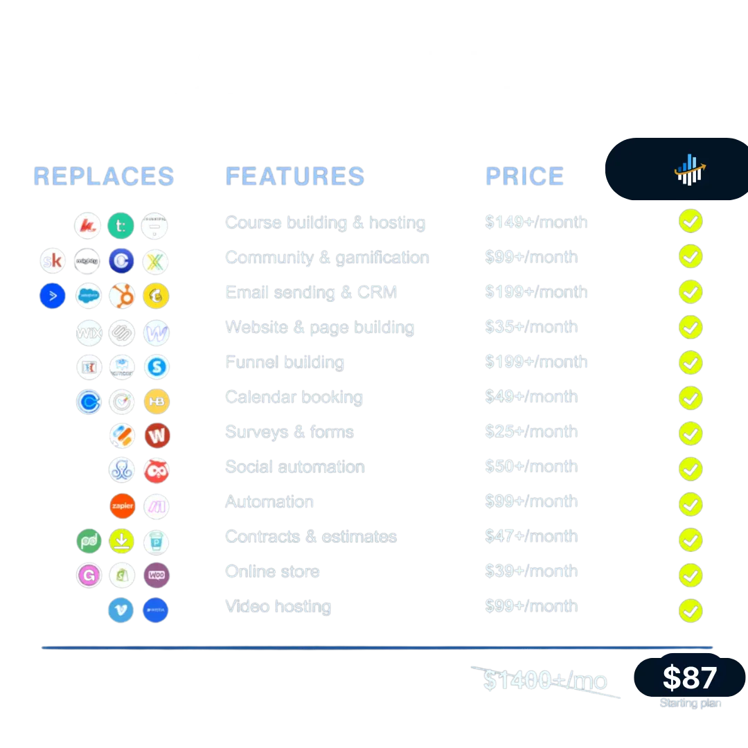 That's the promise. You can ditch Kajabi, Skool, Teachable, Wix, Squarespace, WordPress, ClickFunnels, Mailchimp, ActiveCampaign, Calendly, ManyChat, and countless others. The list is extensive, but the point is clear—we manage everything in one place.